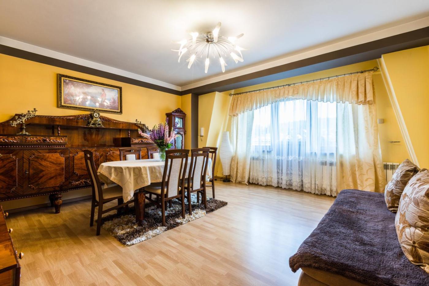 Dom z 4 sypialniami. This holiday home features a hot tub, spa bath and sauna. Guests will find a stovetop, a refrigerator, a dishwasher and kitchenware in the well-equipped kitchen. The holiday home also comes with a barbecue. The spacious holiday home features a washing machine, a private entrance, a terrace with a quiet street view as well as a shared bathroom boasting a walk-in shower. The unit has 5 beds. Dom wakacyjny - 15 osobowy. Powierzchnia pokoju ok.: 300 mkw.